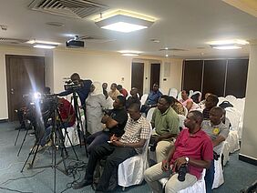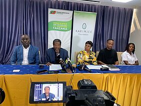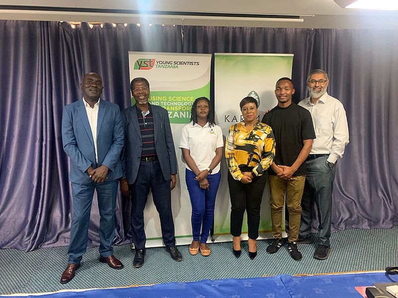 At todays Press Conference promoting YST Exhibition 2024 at JNICC on Thursday 19th September were: JUSTINE BAHATI and LUCY KONYAKI - 2016 - Special YST/Karimjee Education Scholarship, Prof Mgaya , Dr Kamugisha, Caren Rowland - Karimjee Foundation.